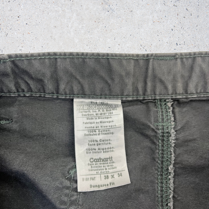 Brand: Carhartt Item: Dungaree Carpenter Pants Colour: Faded Black / Charcoal Grey Size: 38 x 34 (Dungaree Fit) Style:Classic vintage dungaree carpenter pants featuring utility pockets and hammer loop, crafted from durable cotton canvas with...