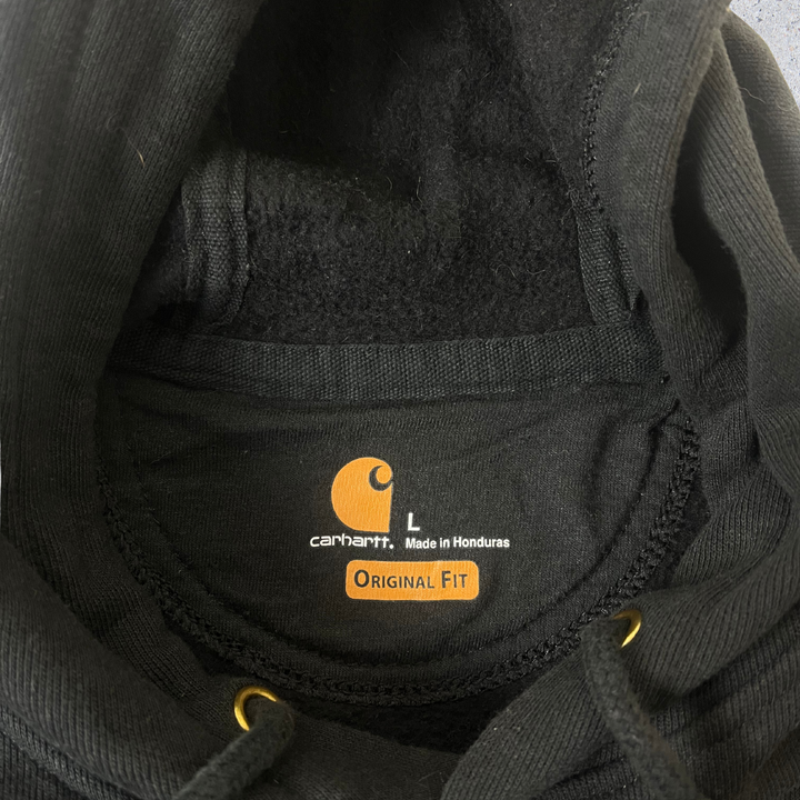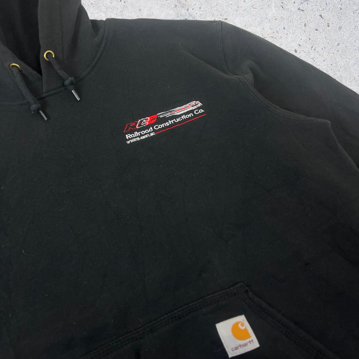 Brand: Carhartt Item: Hoodie (Original Fit) Colour: Black Size: Large Style: Pullover hoodie with drawstring hood and kangaroo pocket Condition: Excellent Condition / Light Wear Details: Carhartt patch logo on front pocket Embroidered Railroad Construction...
