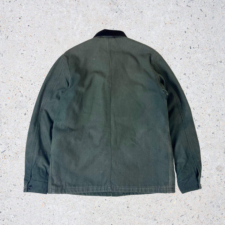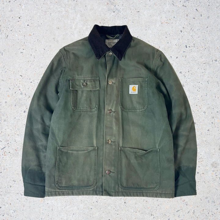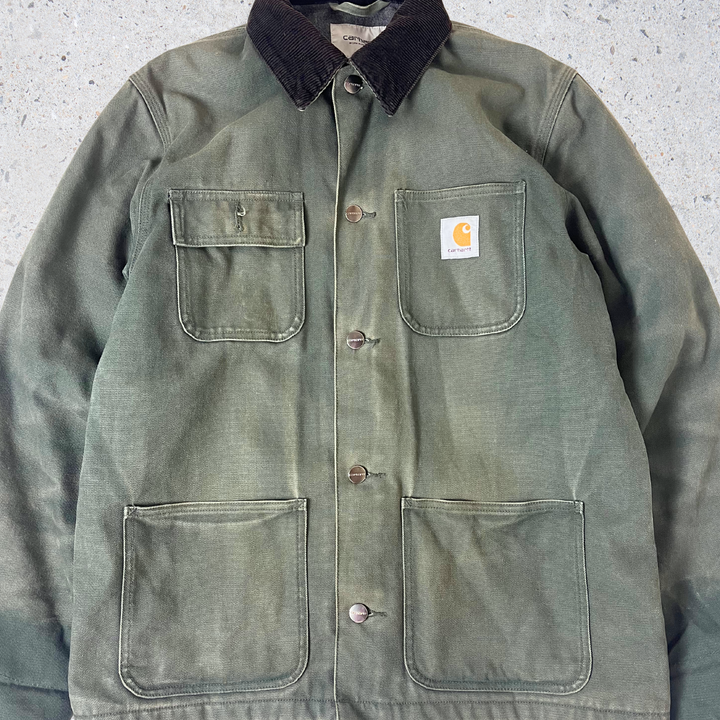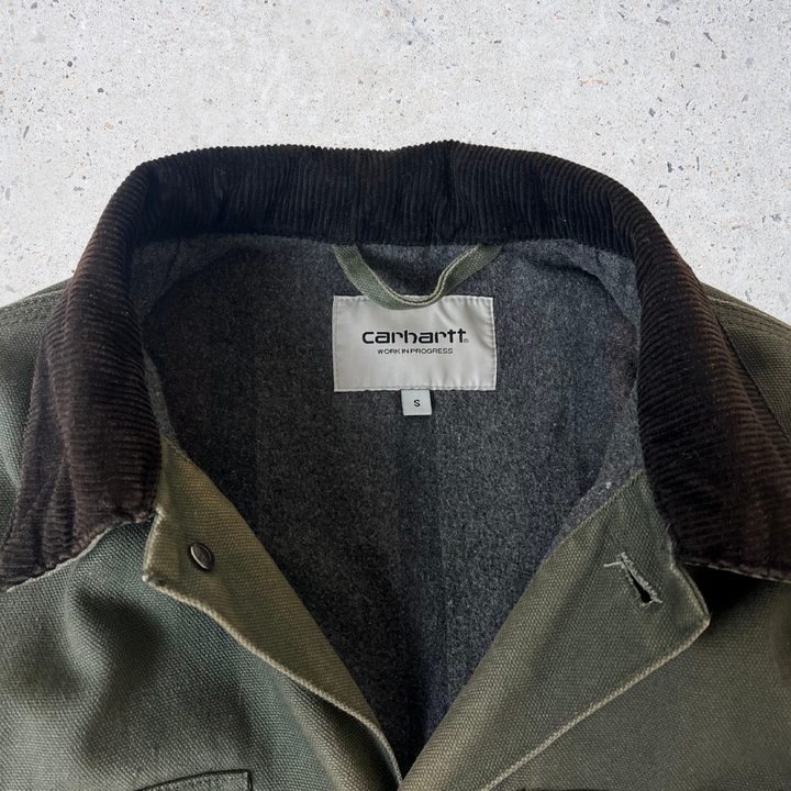 Style: Classic Carhartt Work in Progress chore coat with durable canvas construction and corduroy collar detail