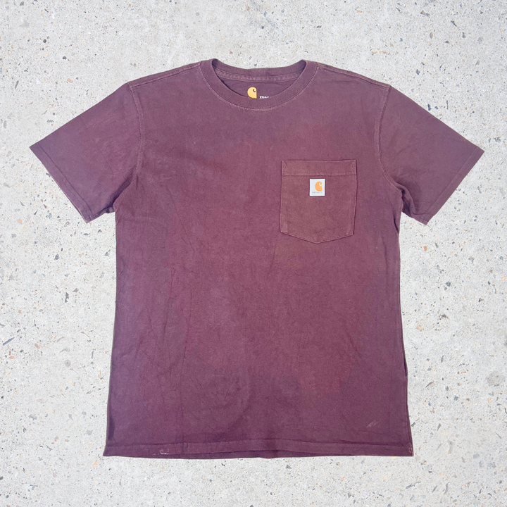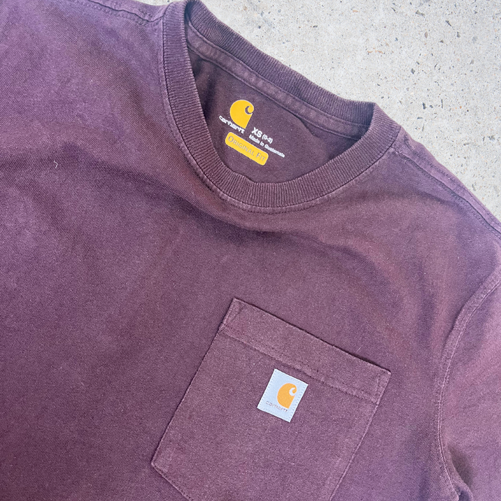 Brand: Carhartt Item: Short Sleeve Pocket T-Shirt Colour: Burgundy Size: XS (Original Fit) Style:Classic Carhartt pocket t-shirt with signature logo patch, designed with a timeless fit for comfort and everyday wear. Condition: Good vintage condition...