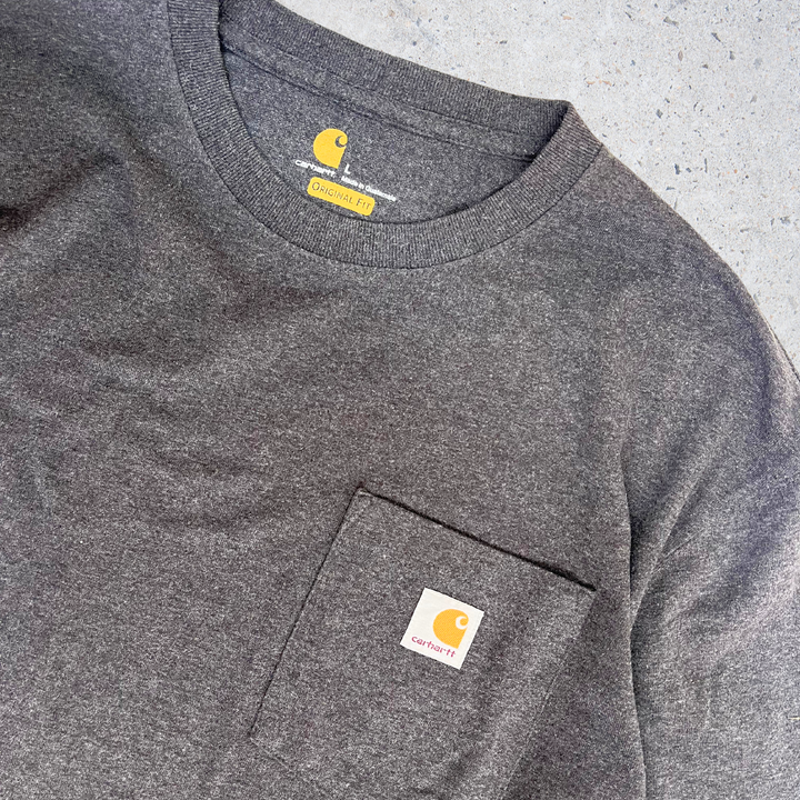 Classic Carhartt long sleeve pocket t-shirt with signature logo patch, designed with an original fit for durable everyday wear.