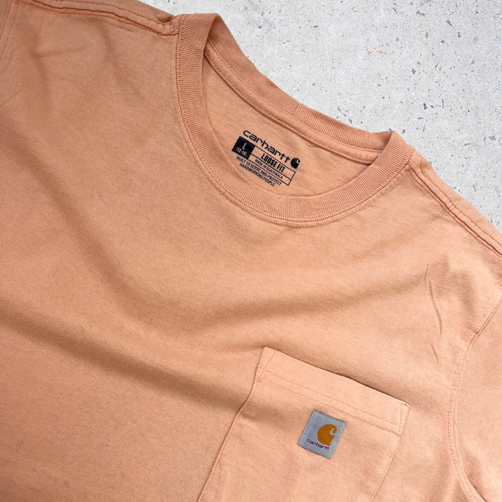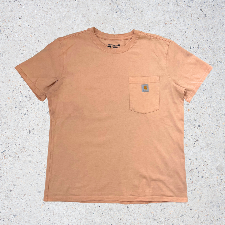 Brand: Carhartt Item: Short Sleeve Pocket T-Shirt Colour: Pink / Peach Size: Large (Women's) Style:Classic Carhartt pocket t-shirt with chest logo patch, built with a loose fit for durability and everyday comfort. Condition: Good vintage condition...