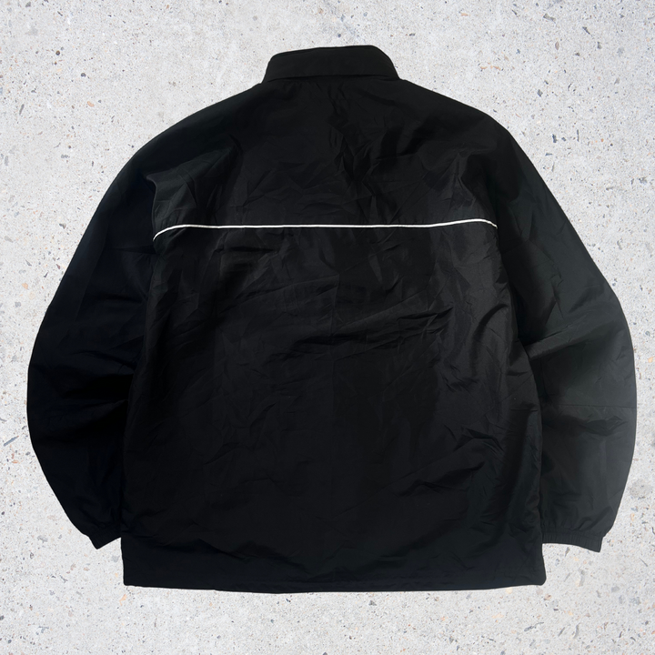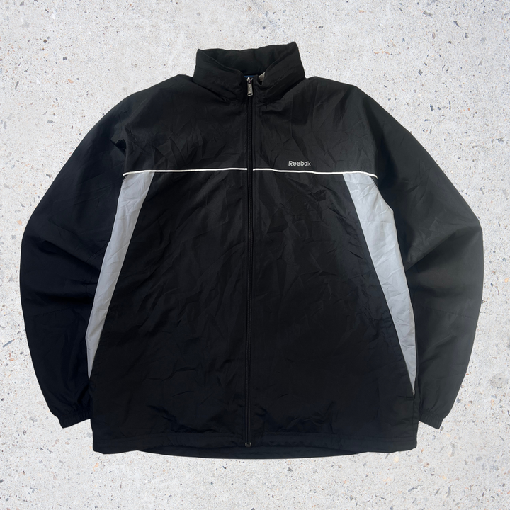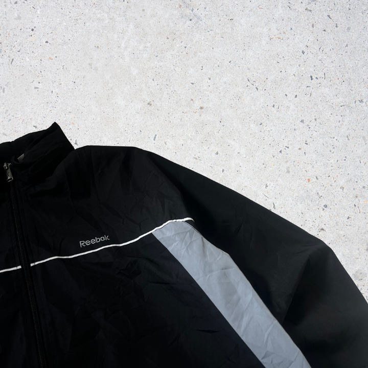 Brand: Reebok Item: Track Jacket Colour: Black with Grey Accents Size: Large Style: Full-zip track/sports jacket with stand-up collar Condition: Excellent Condition Details: Small embroidered Reebok logo on left chest White piping detail across the chest for a clean, sporty...